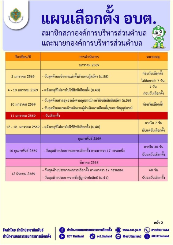 ตามแผนการจัดการเลือกตั้งดังกล่าวกำหนดให้มีการประกาศรับสมัครเลือกตั้งระหว่างวันที่ 1-5 ธันวาคม 2568 และกำหนดวันเลือกตั้งในวันอาทิตย์ที่ 11 มกราคม 2569 ทั้งนี้ การกำหนดวันรับสมัครและวันเลือกตั้งเป็นอำนาจของผู้อำนวยการการเลือกตั้งประจำองค์การบริหารส่วนตำบล โดยต้องได้รับความเห็นชอบจากผู้อำนวยการการเลือกตั้งประจำจังหวัดก่อนประกาศให้มีการเลือกตั้งต่อไป