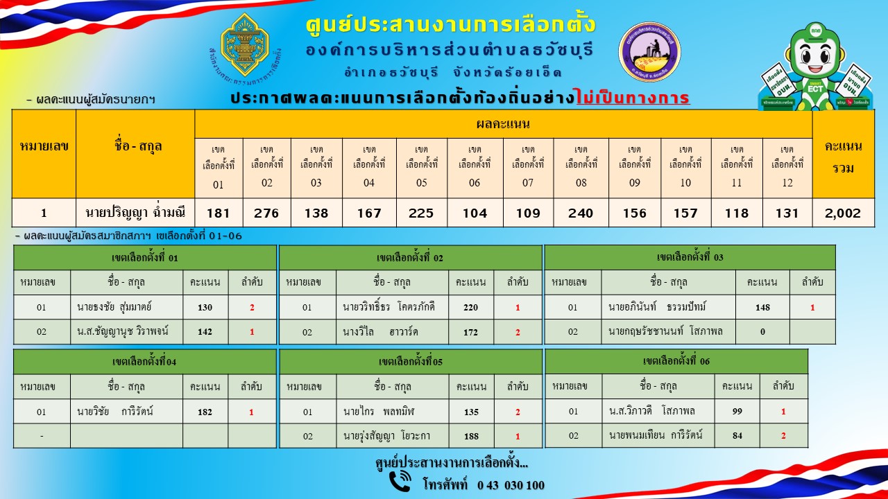 * ผลคะแนนการเลือกตั้งนายกองค์การบริหารส่วนตำบลธวัชบุรี